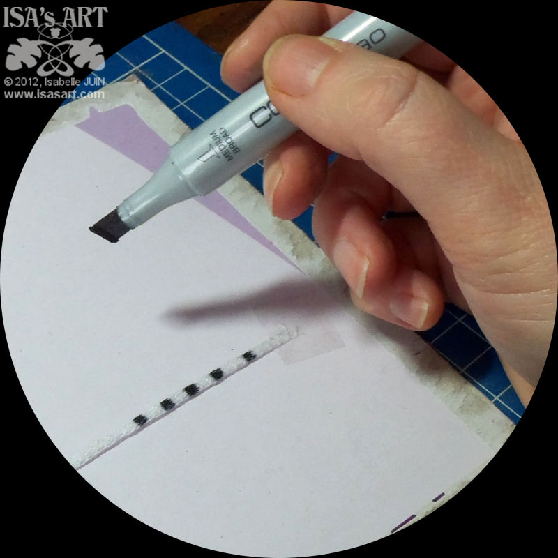 Vous fixez votre lacette et faites de légères applications d'encre au feutre COPIC avec la pointe large, et hop !